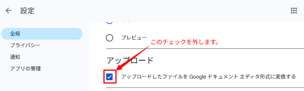 「アップロードしたファイルをGoogleドキュメント エディタ形式に変換する」